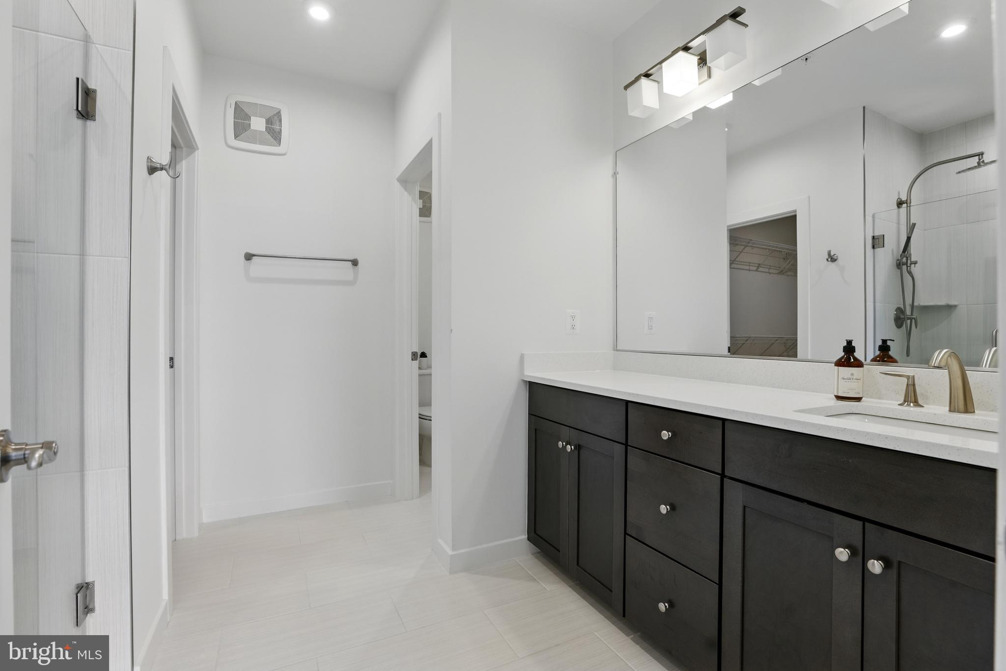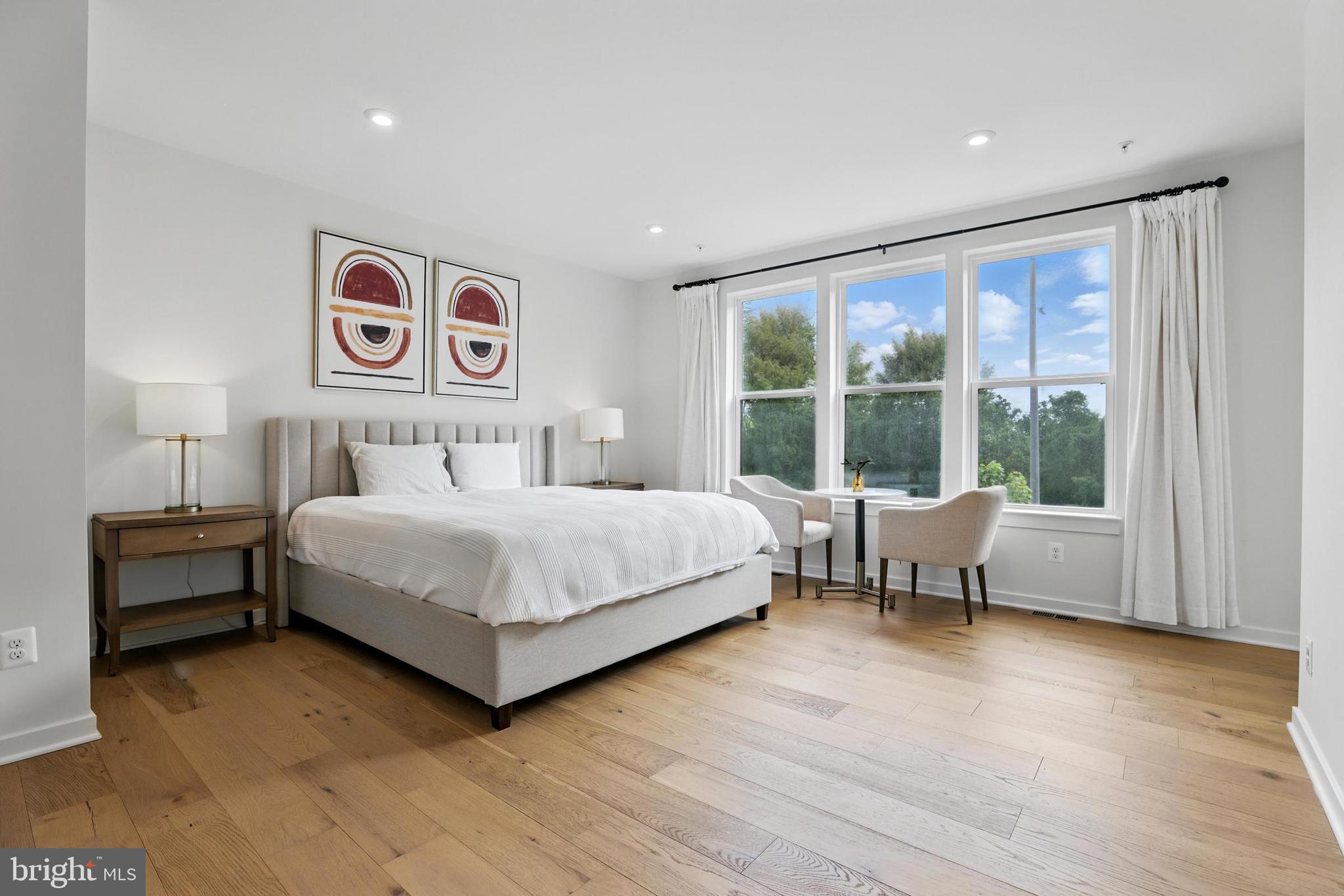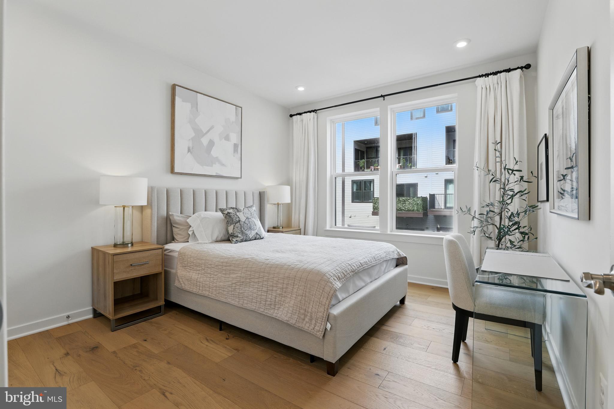 The oversized primary bedroom suite is a true sanctuary, featuring two large walk-in closets and a serene en-suite bathroom. Designed with modern finishes and timeless touches, the bathroom boasts high-end cabinetry, quartz countertops, and a frameless glass shower complete with a hydro-rail system--bringing spa-like luxury to everyday life. The second bedroom is generously sized and bright, with oversized windows that pour in sunlight and create a welcoming atmosphere for guests or family members.