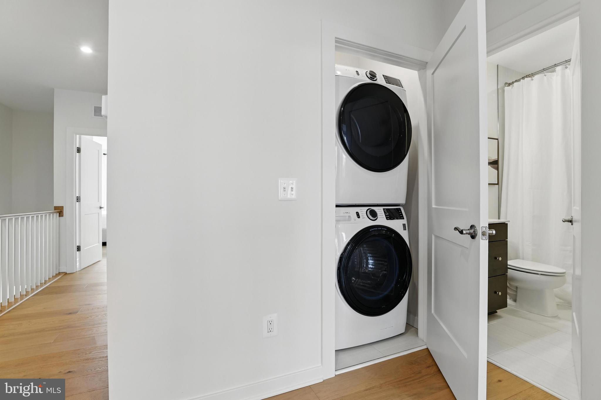 As you make your way upstairs via wide, open stairs, you're greeted by a bright and open loft landing--perfect as a casual lounge, home office, or reading retreat. Just beyond, a private balcony offers a peaceful spot to sip your morning coffee or unwind after work. The laundry area is ideally located on this level, with full-size stacked washer and dryer units that make daily routines feel effortless.