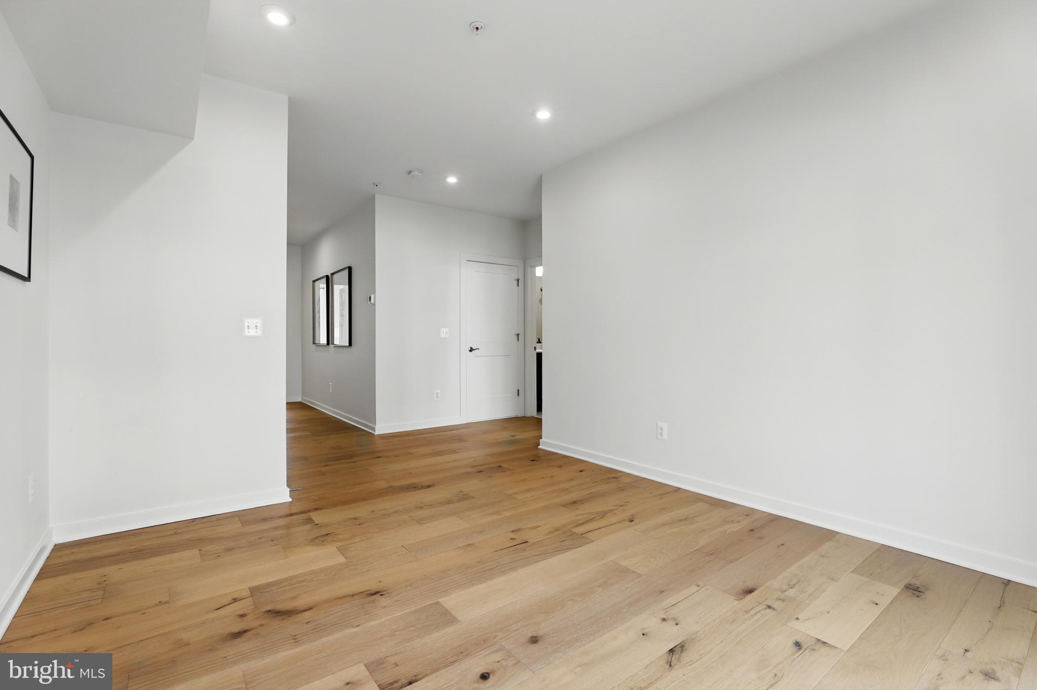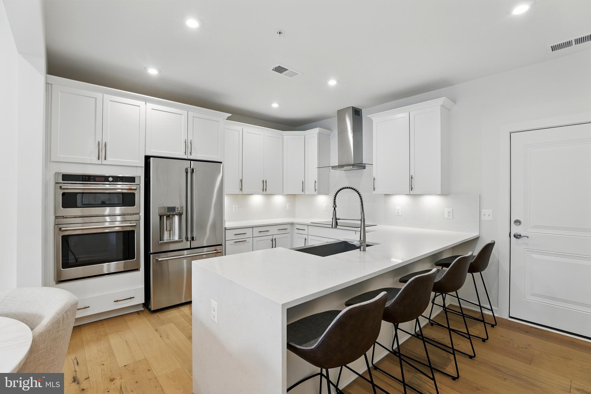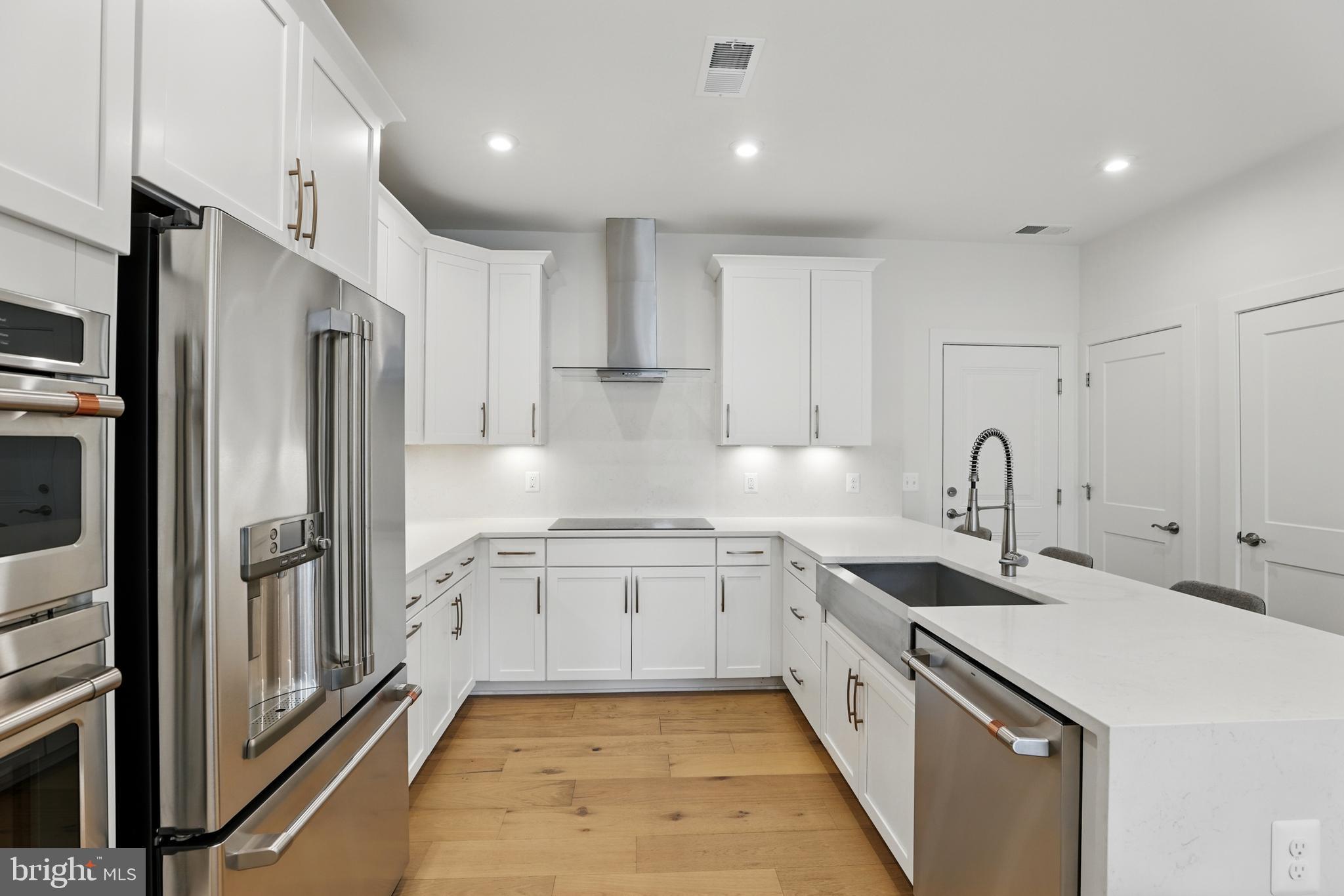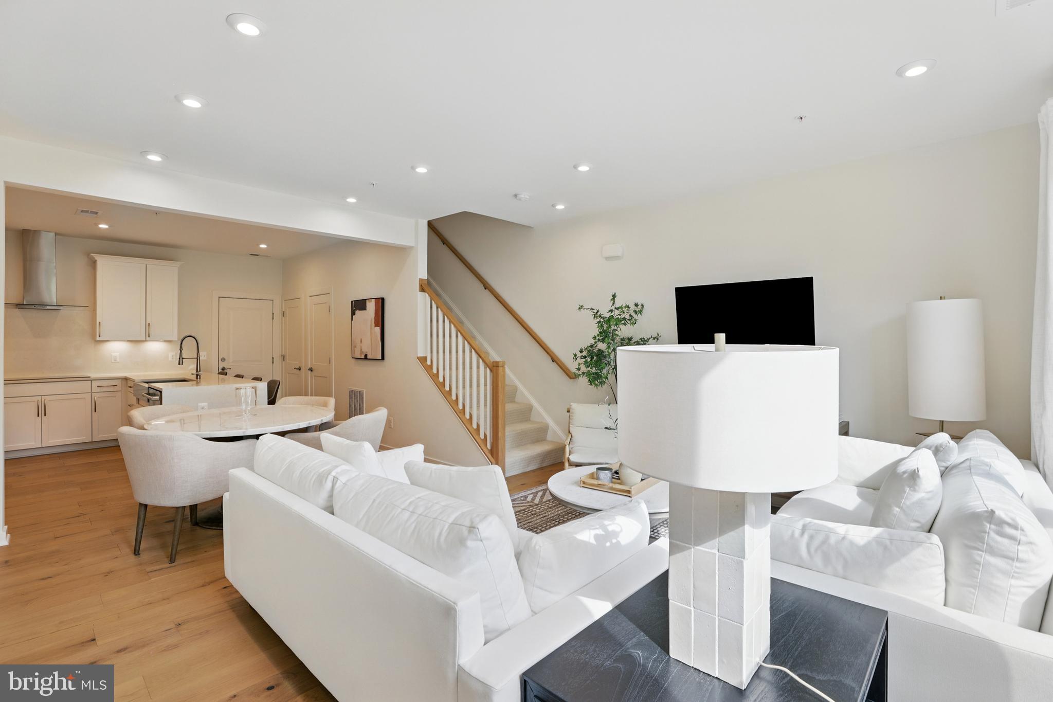 From the moment you step inside, the difference is palpable. The open-concept main level welcomes you with a spacious flow between the living, dining, and kitchen areas, all drenched in natural light and framed by stunning Level 4 engineered hardwood flooring that spans the entire home. The kitchen is nothing short of breathtaking--a true centerpiece that marries beauty and performance. Outfitted with top-of-the-line Cafe stainless steel appliances, it features a high-performance induction cooktop paired with a commercial-grade range hood. A dramatic quartz waterfall island anchors the space, with the same rich stone extending up the backsplash all the way to the ceiling, creating a clean, continuous look. Thoughtfully designed soft-close cabinetry includes a built-in pull-out trash system and under-cabinet lighting, while the oversized, extended sink adds both function and flair. A walk-in pantry and entry coat closet add smart storage solutions without sacrificing aesthetics.