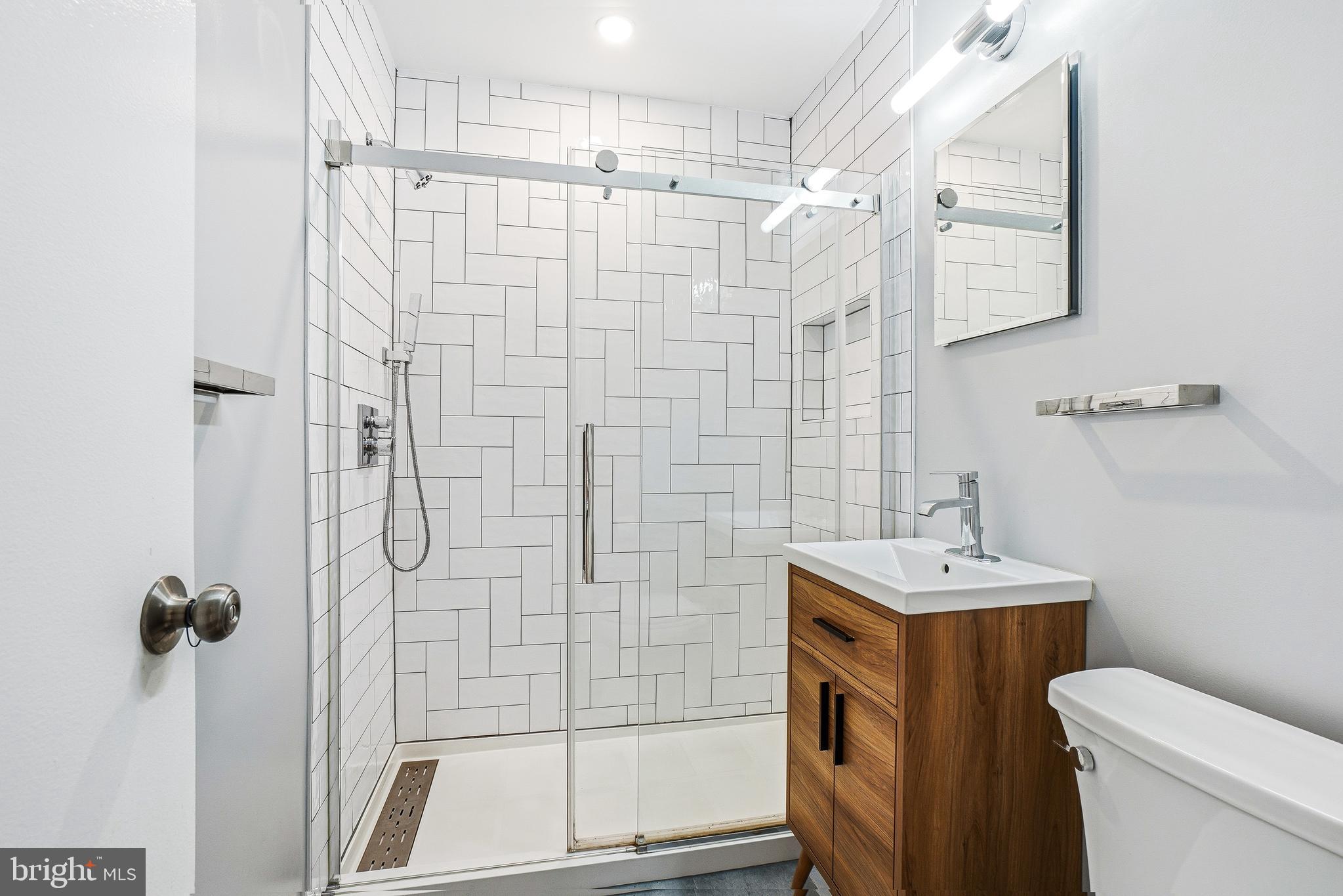 The oversized living room is filled with natural light from a large picture window overlooking the tree line. The spacious bedroom includes a generous closet, and the updated full bath offers a walk-in glass and tile shower with a modern vanity and fixtures.